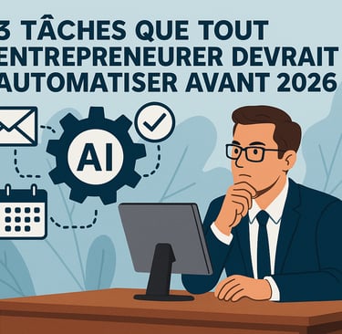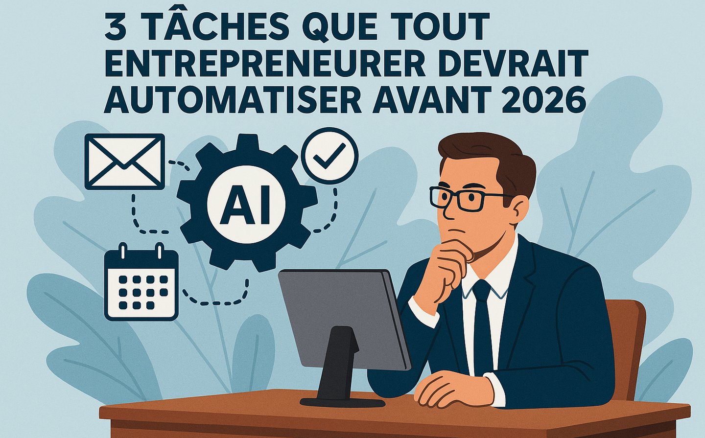 Description de l'article de blog : Les entrepreneurs se noient dans des tâches répétitives qui consomment temps et énergie. Découvrez les trois tâches essentielles à automatiser avant 2026 pour regagner du temps, de la clarté et de la performance grâce à l’IA.